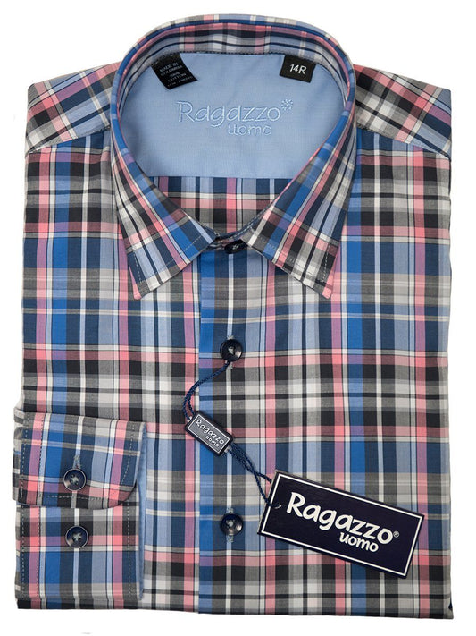 Ragazzo 26292 Boy's Sport Shirt - Cotton - Blue and Pink, Plaid Long Sleeve