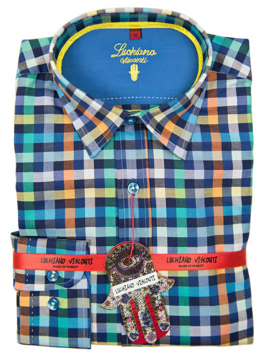 Luchiano Visconti Boy's Sport Shirt 27439 Blue/Orange Plaid
