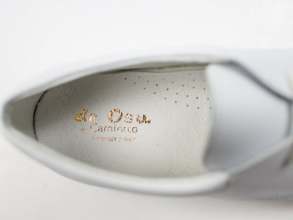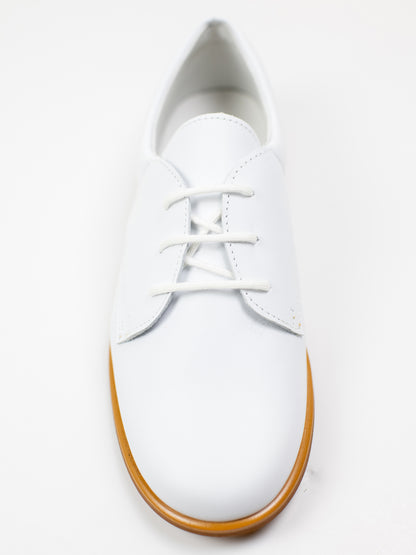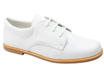 The De Osu 30635 leather boy's dress shoe will make him look modern, and feel stylish. The shoe is hand crafted in Spain, using premium leathers. With full leather lining, a rubber sole and leather welt, these shoes provide a sophisticated take on a stylish look. This boy's white dress shoe is an ideal choice for events year round. Featuring a lace up design, he will look absolutely sophisticated at a first communion, social gatherings, family dinners and more. A rubber bottom delivers safety on slick surfaces, with a quiet tread. By boy's formal footwear designer, De Osu