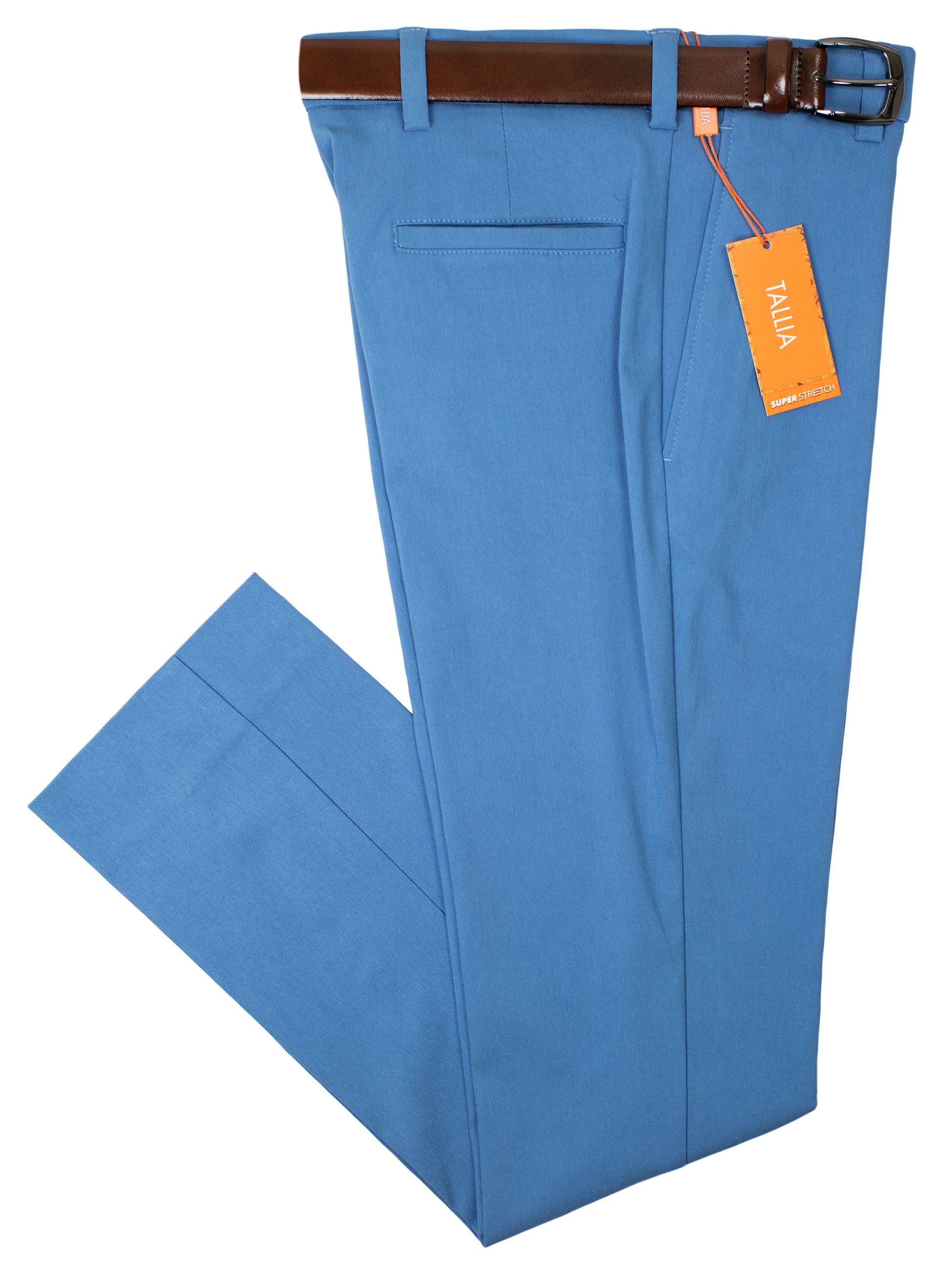 The perfect look requires a proper fit. Tallia 30772 Blue Super Stretch Boys Casual Pants provides just that. A 78% rayon/19% nylon/3% spandex fabric. This super stretch casual pant, blue colored is comfortable for all day use. The pants are plain front, with quarter top pockets, 2 besom back pockets, finished bottom, and machine washable.