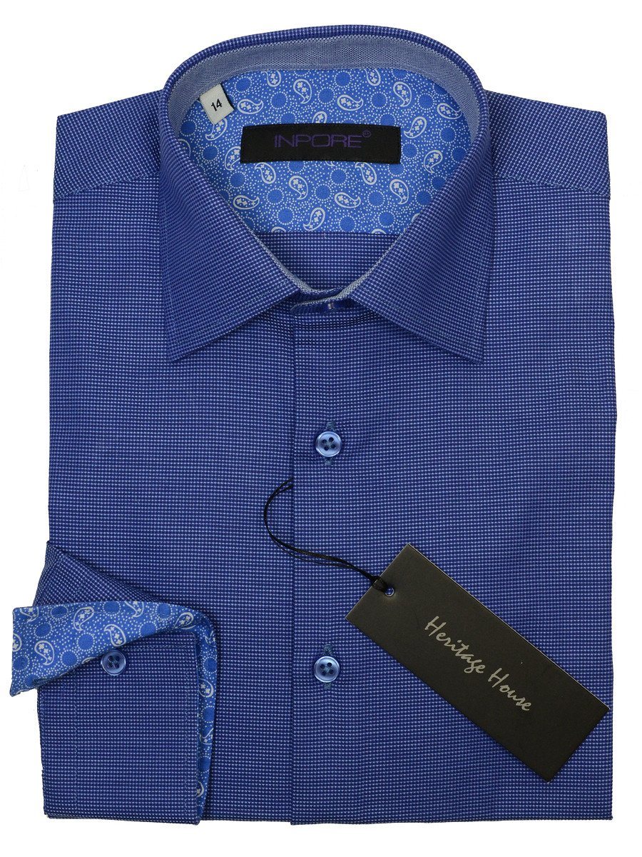 If you are looking to make a bold statement, but want a more sophisticated look, the Inpore 18970 100% Cotton Slim Fit Boy's Dress Shirt is ideal. Inpore dress shirts are a great way to make a bold statement, with unforgettable, yet stylish quality. With features like a long sleeve, button cuff, modified spread collar, contrast paisley cuff and collar, no pocket, and contemporary slim fit for a true and hassle free fit. And with a machine washable construction, this 100% cotton Boy's Dress Shirt is easy to care for.