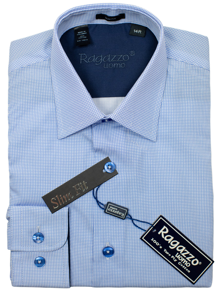 He'll look as sophisticated and comfortable by the end of any event as he did at the begining of it with the elegant Ragazzo 30889 100% Cotton Boy's Dress Shirt. Make sure he'll stand out in the crowd and look just as sophisticated as you know he is in a dress shirt from fashion designer Ragazzo. The boy's dress shirt features slim fit, modified spread collar, long sleeve, button cuff, and contrast interior collar. This nailhead pattern shirt is sure to catch everyone's eye. Contrast cuff and seamless placket offer a custom style. Easy to care for, made of 100% cotton fabric, this dress shirt is machine washable.