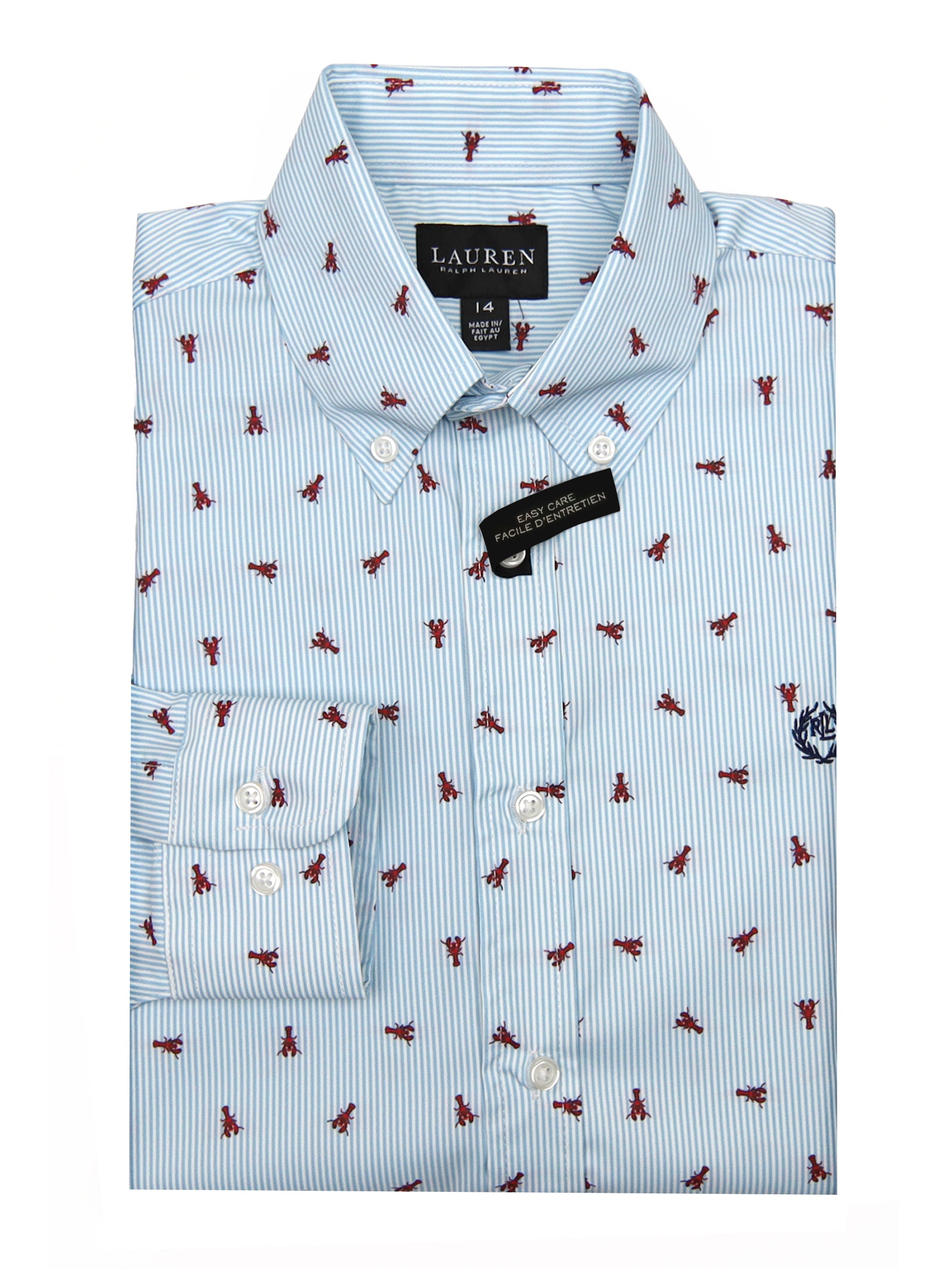 Features of the Lauren Ralph Lauren 33639 93% Polyester/ 7% Spandex Boy's Dress Shirt - Stripe Dress Shirt With Red Lobsters - Blue/White