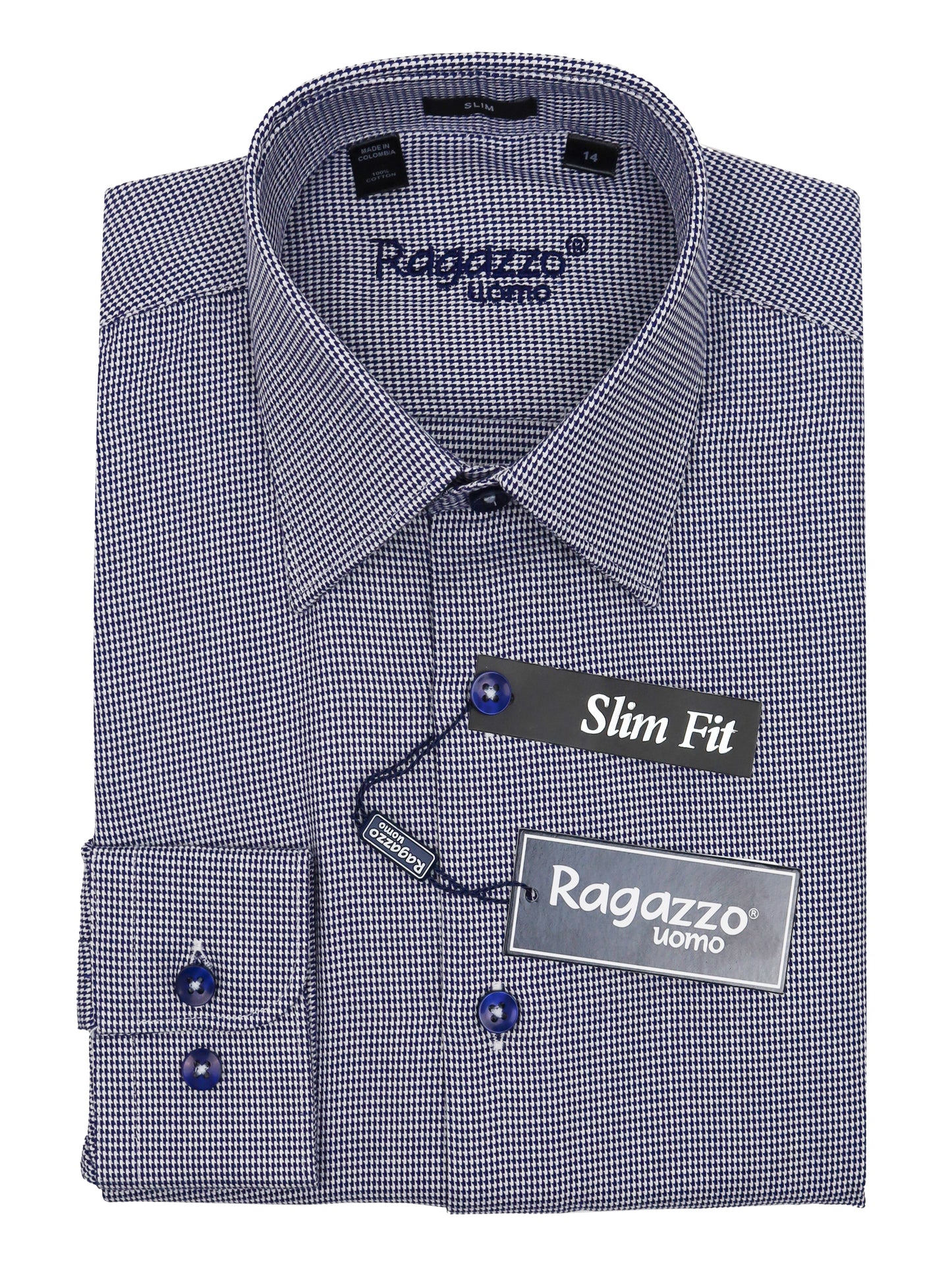 Features of the Ragazzo 34892 100% Cotton Boy's Dress Shirt - Slim Fit Neat Pattern - Dark Blue, Slim Fit- Breathable 100% cotton fabric