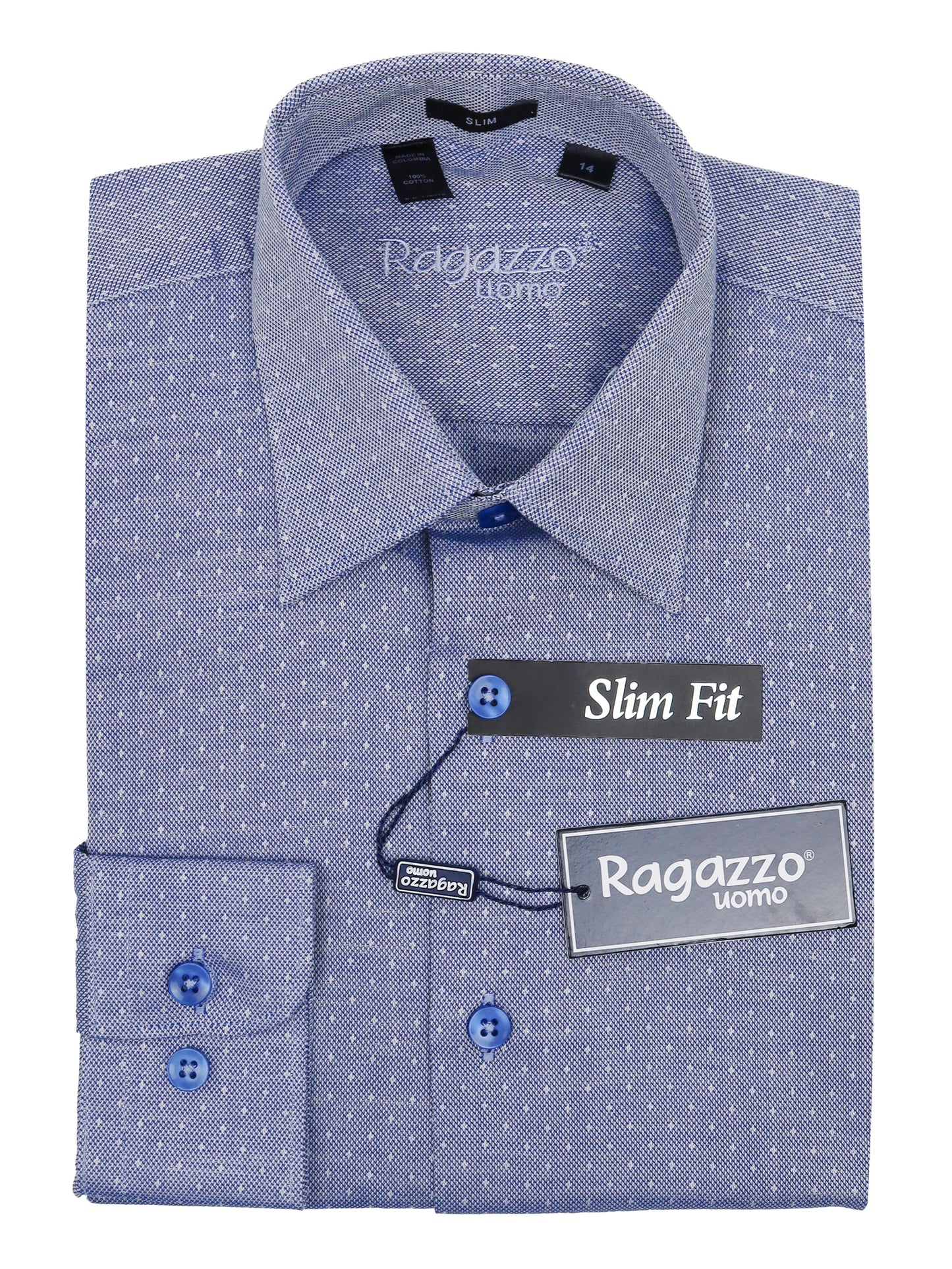 Make him look unforgettable at any important function with a Ragazzo shirt. He'll feel as cool and comfortable by the end of any event as he did at the begining of it with the elegant Ragazzo 34899 100% Cotton Slim Fit Boy's Dress Shirt. Featuring a slim fit neat pattern style and modified spread collar, he will look his best, leaving a lasting impression. Long sleeve, button cuff, no pocket, French Front, and color keyed buttons for a timeless and finished feel. Machine washable for easy care.