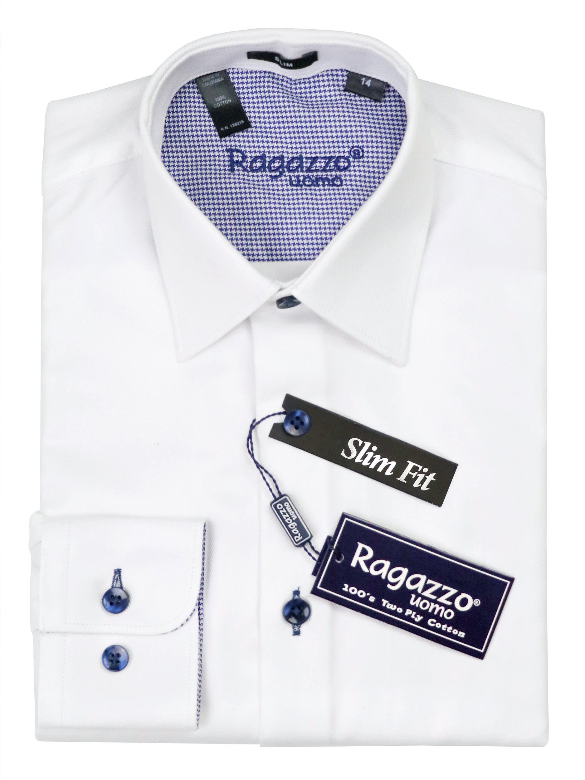 Ragazzo 37547 Boy's Long Sleeve Sport Shirt - Diagonal Tonal Weave - Slim Fit - White/Navy