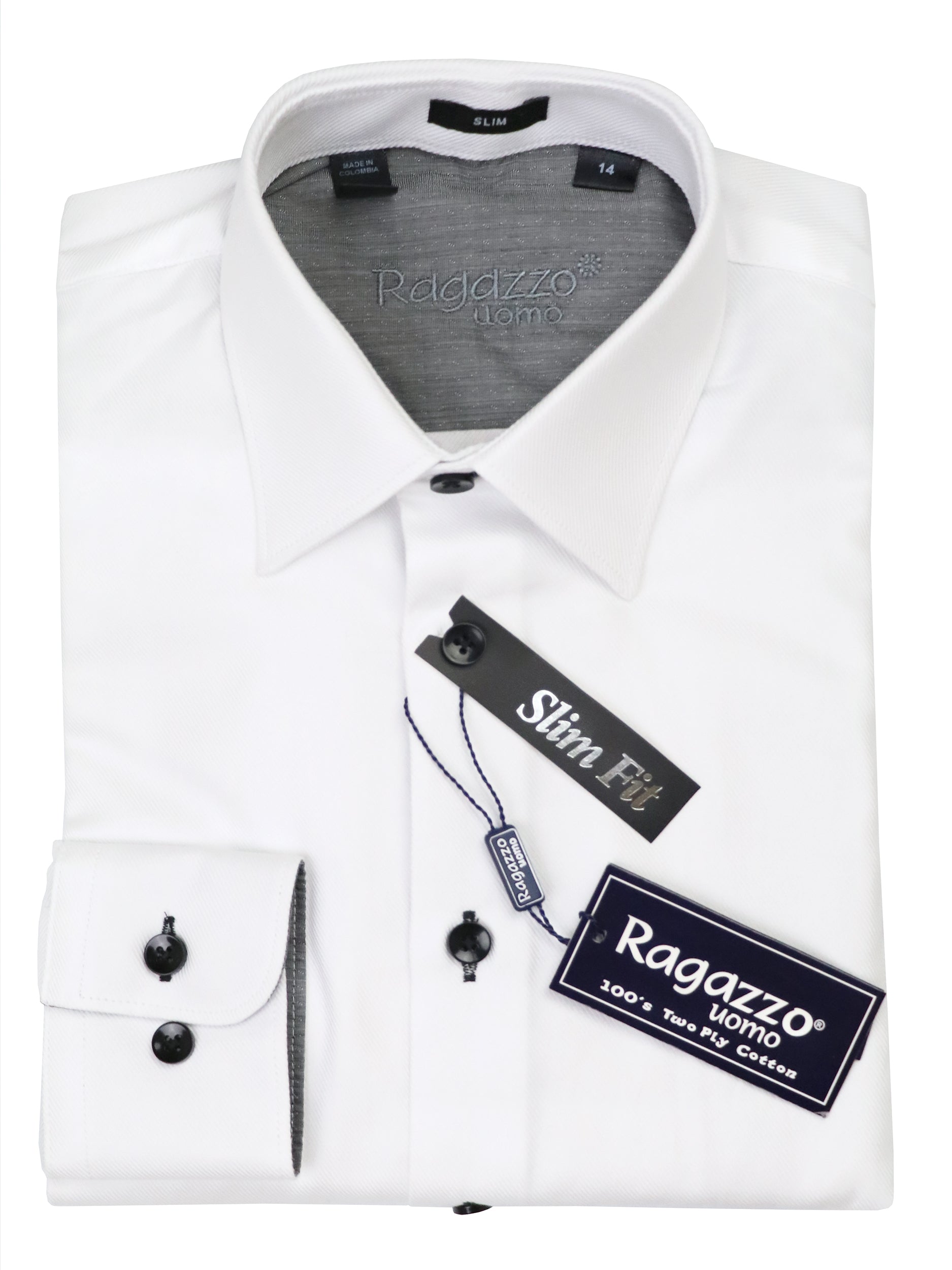 Ragazzo 37554 Boy's Long Sleeve Sport Shirt - Diagonal Tonal Weave - Slim Fit - White/Black