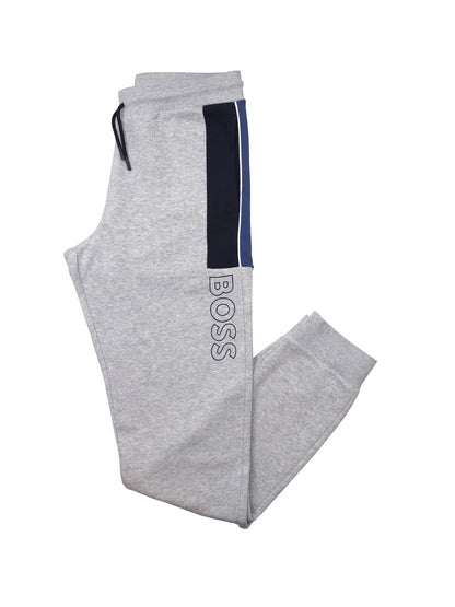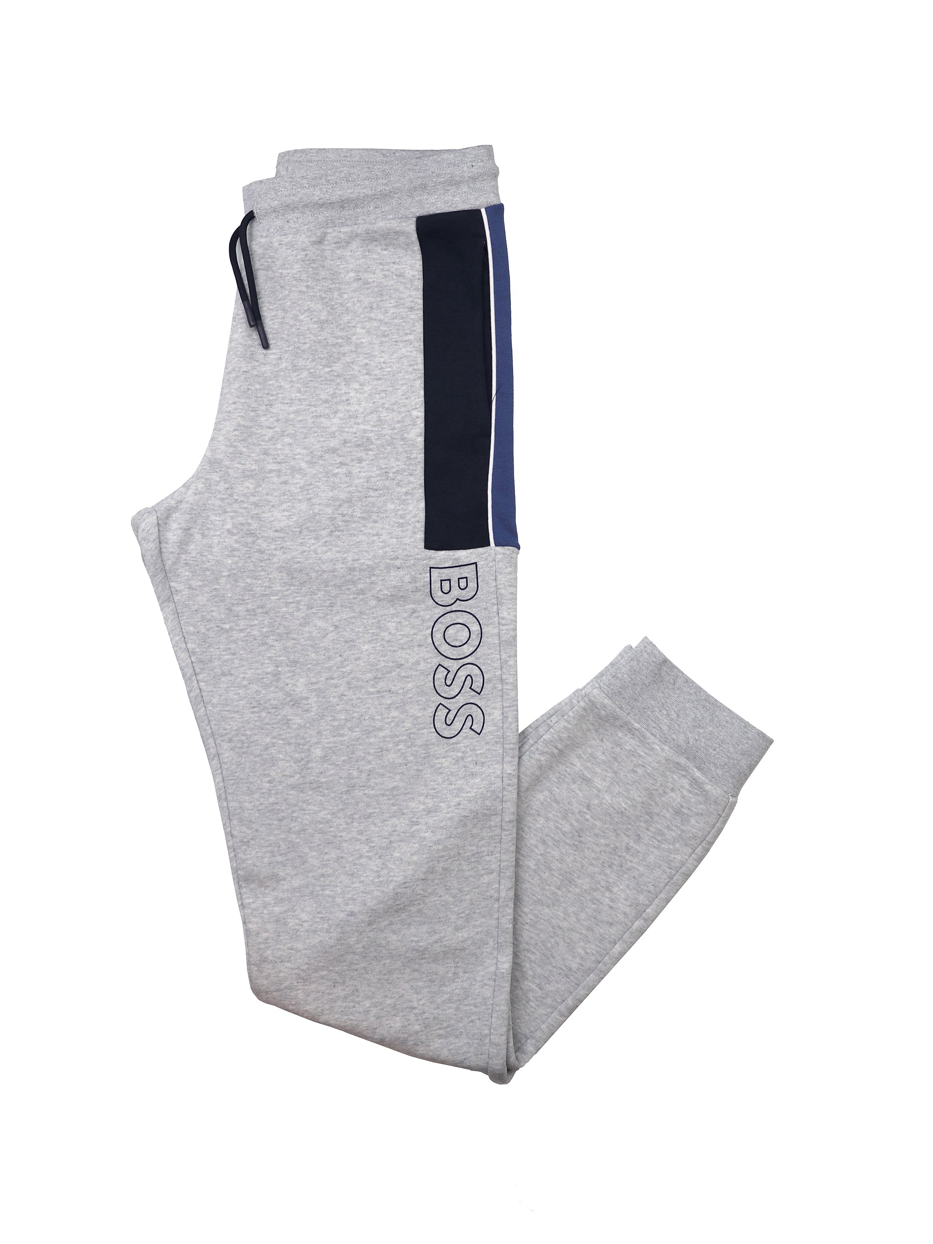 - Pants: Jogger-style sweatpants, elastic waistband with drawstring, two on-seam hip pockets, Boss text logo on side leg