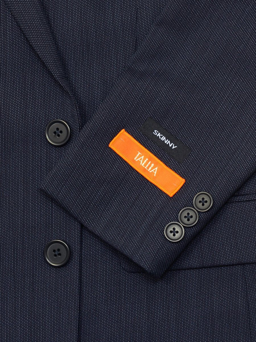 - Jacket: 2-Button Single Breasted, Fully Lined Jacket with Polka Dot Pattern and Orange Piping, with a Skinny Contemporary Fit, a Notched Skinny Lapel, a Functional Breast Pocket, 2 Hip Flap Pockets, 2 Inside Breast Pockets, 1 Inside Cellphone Pocket, and Side Vents