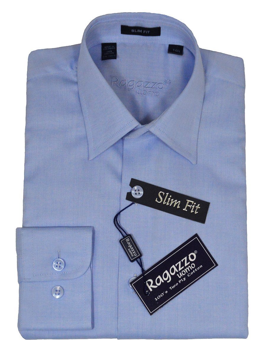 Help him look as handsome as he feels and as you know he can be with the Ragazzo 21583 100% Cotton Slim Fit Boy's Dress Shirt. Bring out the proper little gentleman in him with boy's shirts and formal wear from Ragazzo. This contemporary slim fit boy's shirt features a long sleeve, a modified spread collar, and a button cuff, this boy's shirt is sure to leave a lasting impression. No pocket offers a true appearance. Machine washable and easy iron.