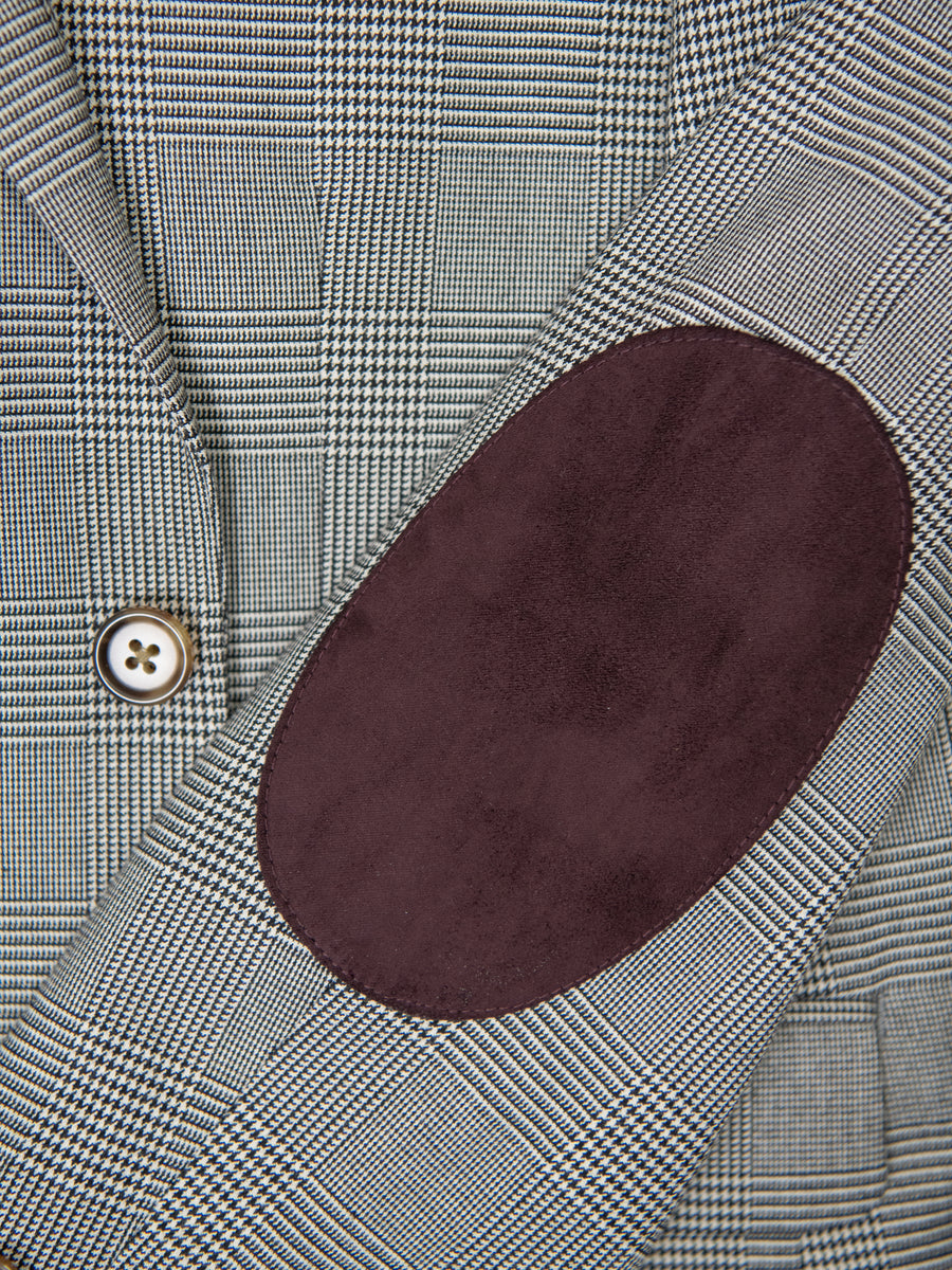 - Jacket: Two button single breasted with two hip flap pockets, a single breast pocket, a lapel button hole with a center vent, suede elbow patches, two interior breast pockets, and one interior accessory pocket.