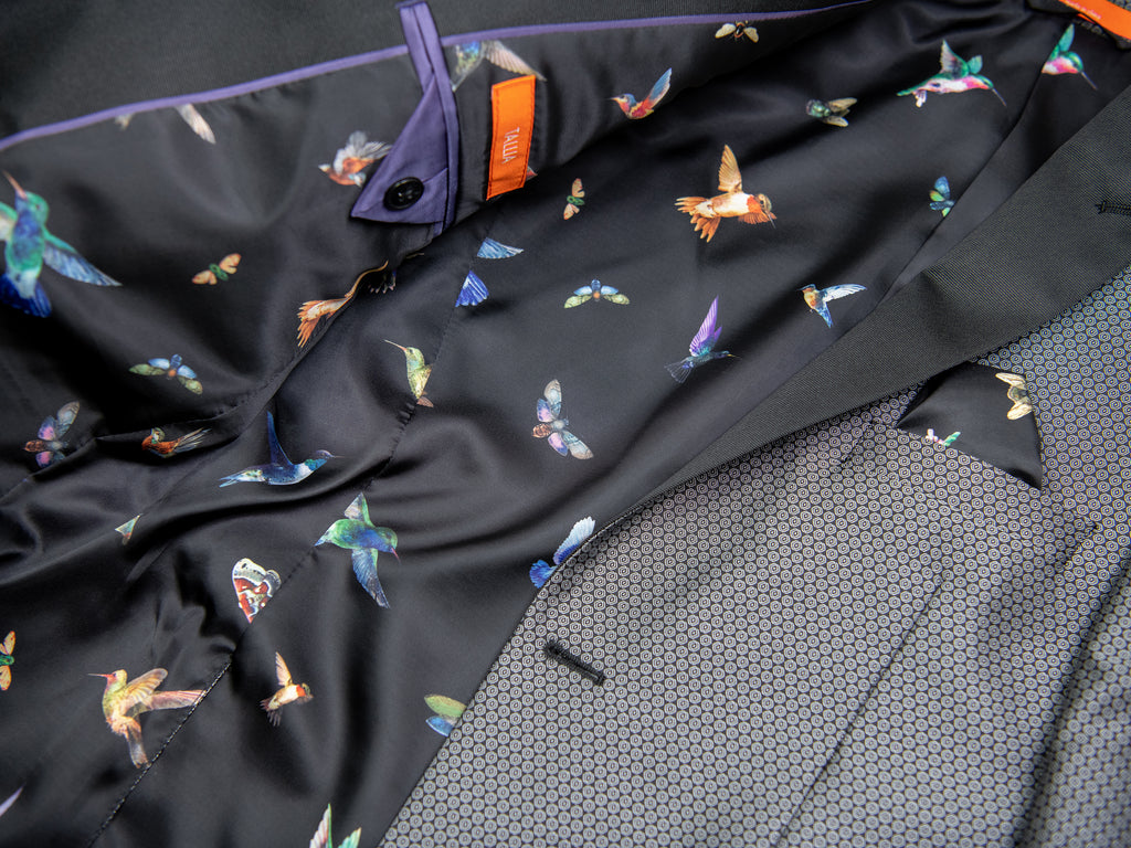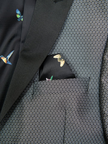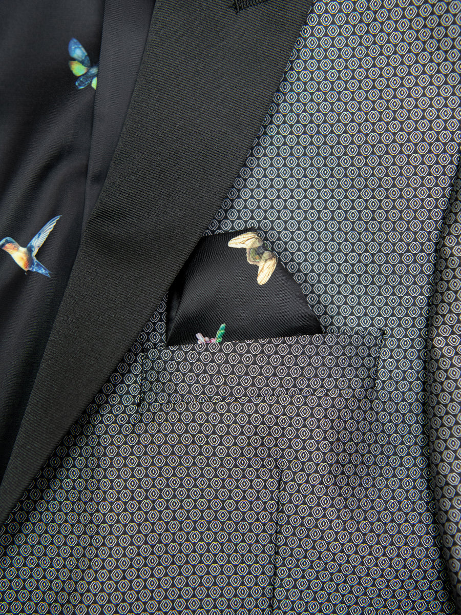 • Jacket: One button single breasted with a side vents with a grograin peak lapel , an one breast pocket with built-in pocket square, two hip flap pockets with grograin trim with a stylized lining, a contrast interior piping with two interior breast pockets, and one accessory pocket.