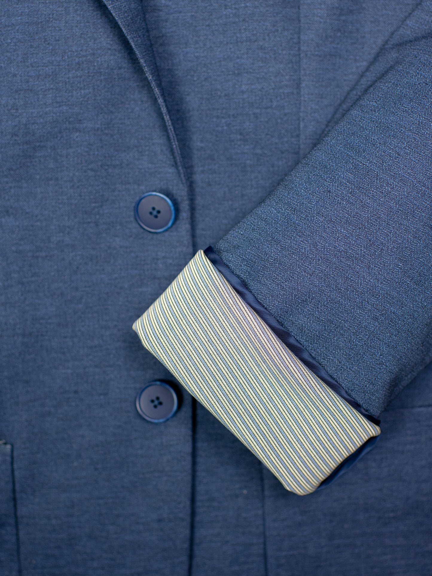 He will feel sophisticated and stylin' in the 30803 Blue Double Faced Boys Sport Coat. With memorable style, this Boys Sport Coat features a double faced fabric in a blue color. The sleeves can be rolled up for a sporty look. Composed of 85% poly/8% rayon/7% spandex, which provides exceptional comfort. This 2 button single breasted Boys Sport Coat comes with side vents, notch lapel , and half interior lining. There are two patch pockets, two interior besom breast pockets, and one interior besom accessory pocket provided ample room for his necessities.
