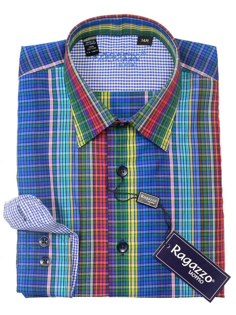 Ragazzo 20459 100% Cotton Boy's Sport Shirt - Plaid - Blue/Multi, Modified Spread Collar