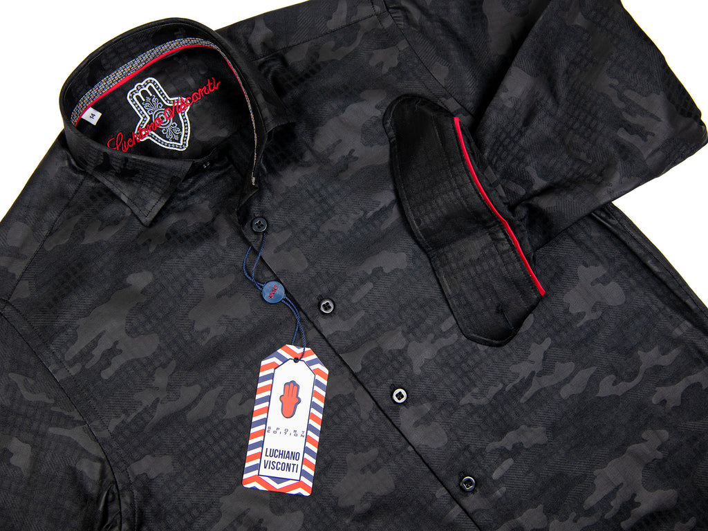 Features of the Luchiano Visconti 29610 67% Cotton/33% Modal Boy's Sport Shirt - Camouflage Tonal Print - Black- Breathable 67% cotton/33% modal fabric
