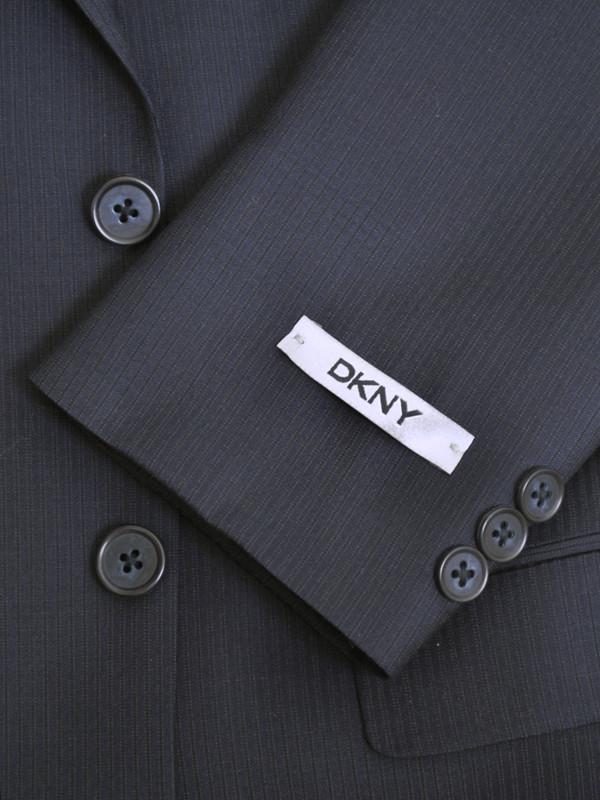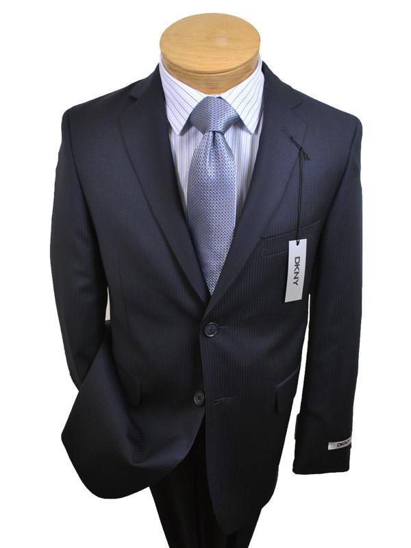 He'll look good in a flash, and feel confident in the DKNY 13733 100% Tropical Worsted Wool Boy's Suit - Stripe - Navy. In a stripe style, classic navy color, and made from 100% tropical worsted wool fabric, this suit is ideal for weddings, graduations, and holiday parties year-round. The two-button single breasted jacket is fully lined, and features a notched lapel, lapel buttonhole, and side vents for added comfort. A functional breast pocket, two hip flap pockets, two inside breast pockets, and 1 accessory pocket offers ample room for all his gizmos, and gadgets. The plain front pants are lined to knee, with quarter top pockets, 1-button through besom back pockets. Easy alteration is provided with a split waist band with approx. 1.5 inches of let out room, and an unfinished bottom. Dry Clean Only. By innovative boy's fashion designer, DKNY.