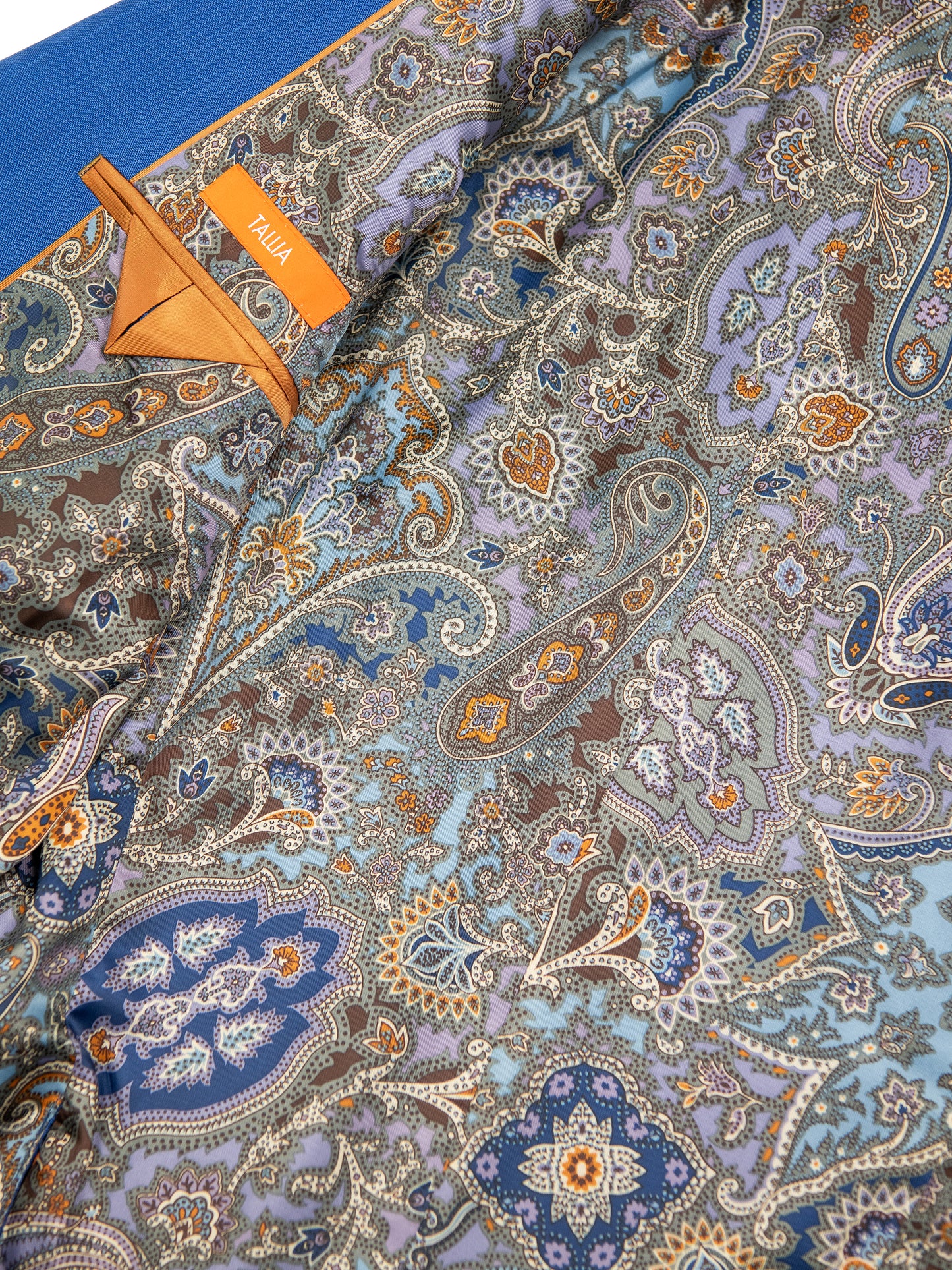 - Jacket: Fully lined with two button single breasted, a side vents with a notched lapel with two hip flap pockets with two inner besom pockets, and stylized lining.