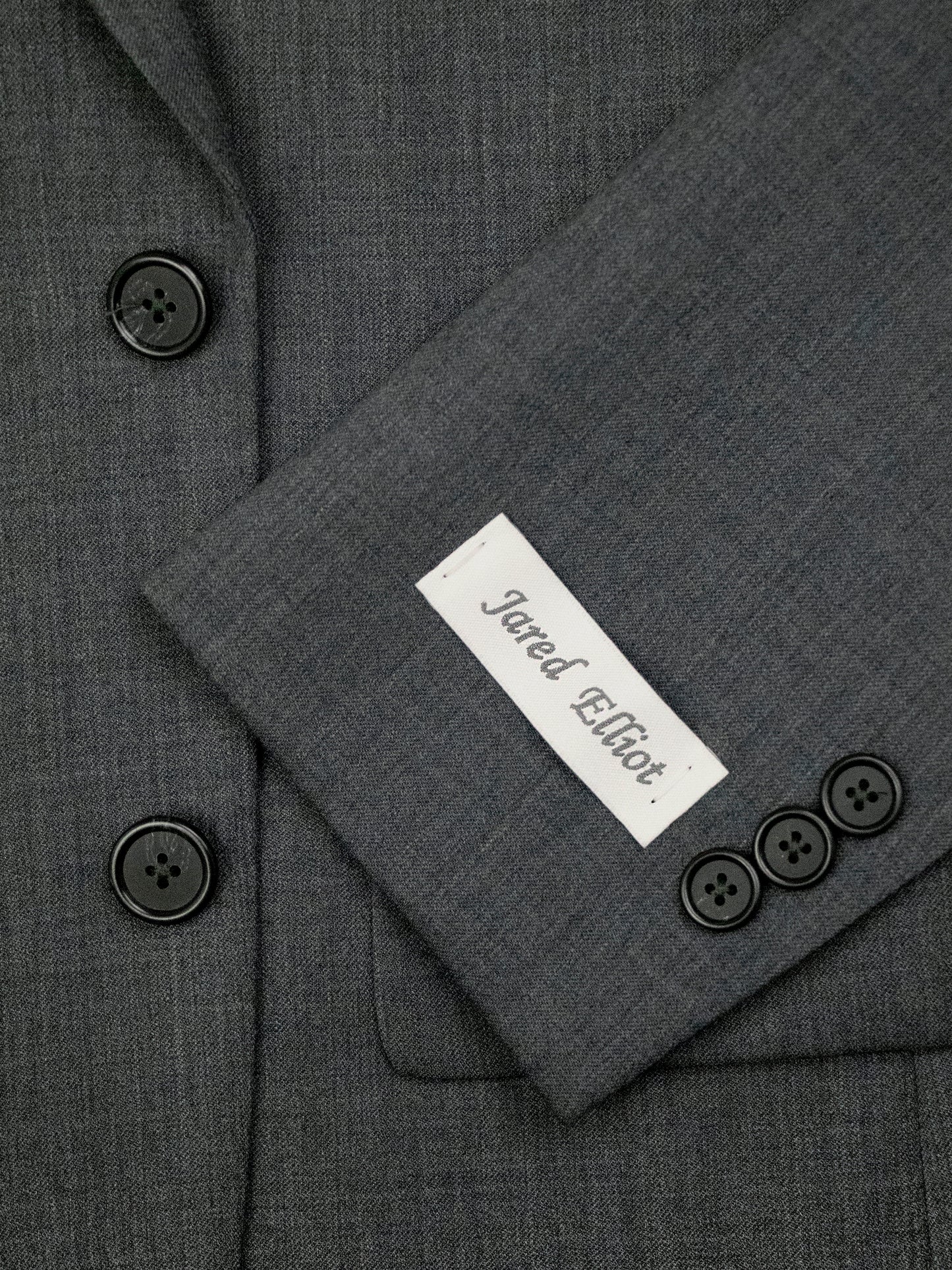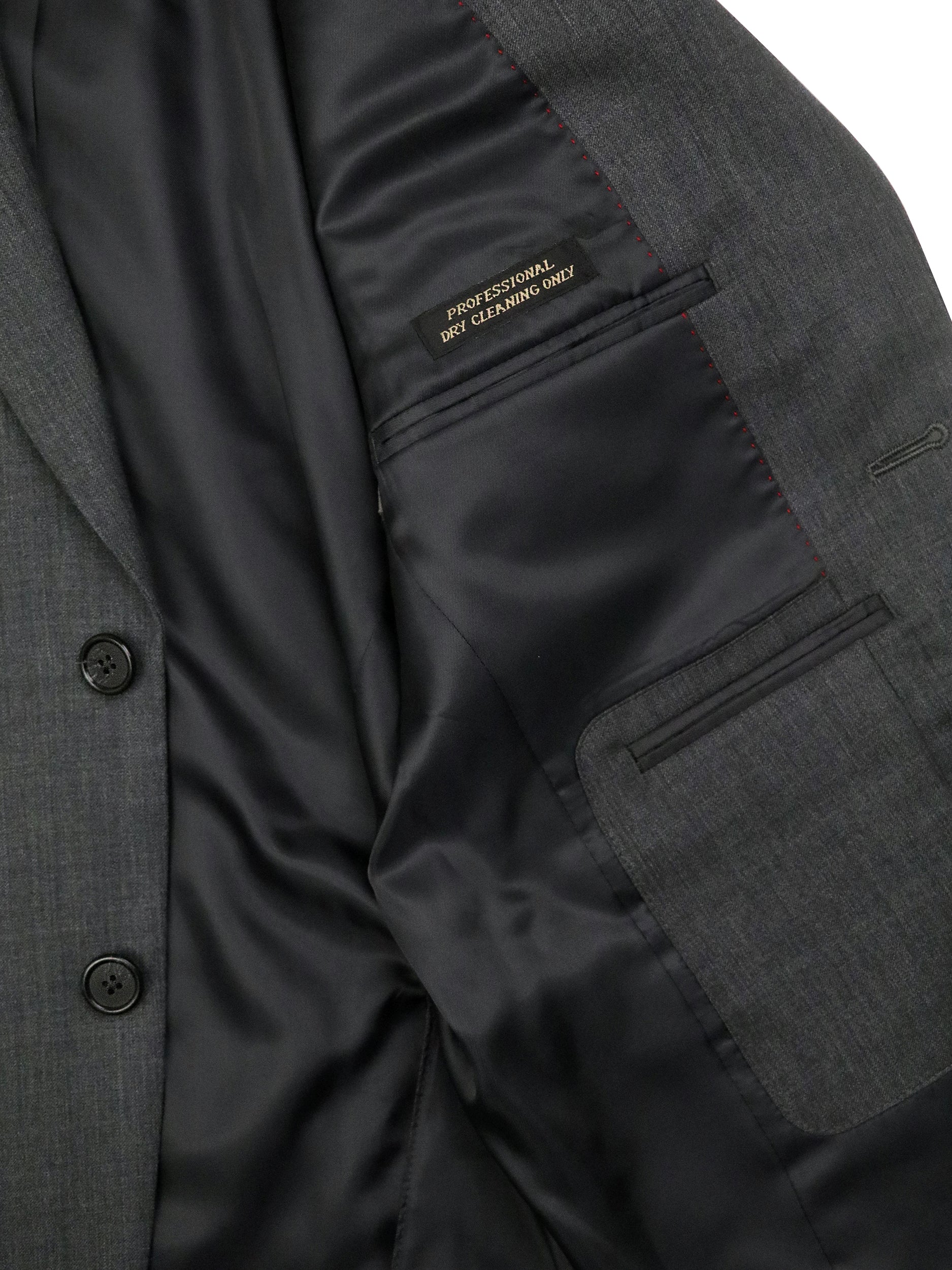 - Jacket: Two button single breasted with a side vents with a notch lapel with button hole, a single exterior welt breast pocket, two exteior hip flap pockets, and split sleeves.