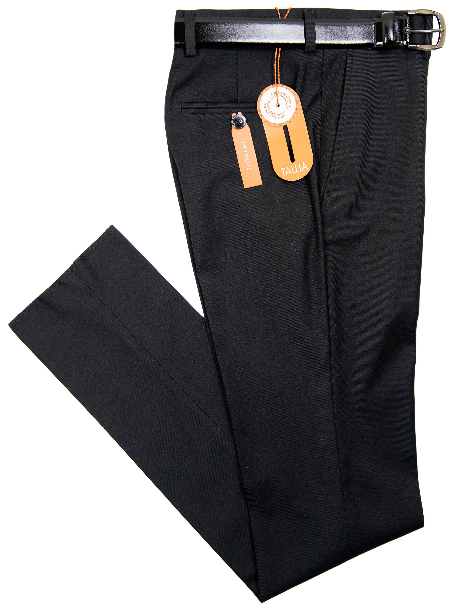 A modern look and fit that gives your boy a dapper look, the 32021P Black Skinny Fit Boys' Dress Pant in a stretch fabric. Composed out of 68% Polyester/29% Viscose/3% Elastane, this Boy's dress pant is breathable and comfortable. Featuring a skinny fit in a stretch fabric with Black coloring, this Boy's suit separate pant can be paired with a bold dress shirt, for a clean look year long. The skinny fit pants feature quarter top pockets, single button thru besom back pocket, adjustable stylized waistband with button elastic, 1.5'' of let out room in waist, and narrow leg. Dry Clean Only. This boy's suit separate pant matches the Tallia Boy's Suit 32021 Suit Separate Jacket. Sold Separately.