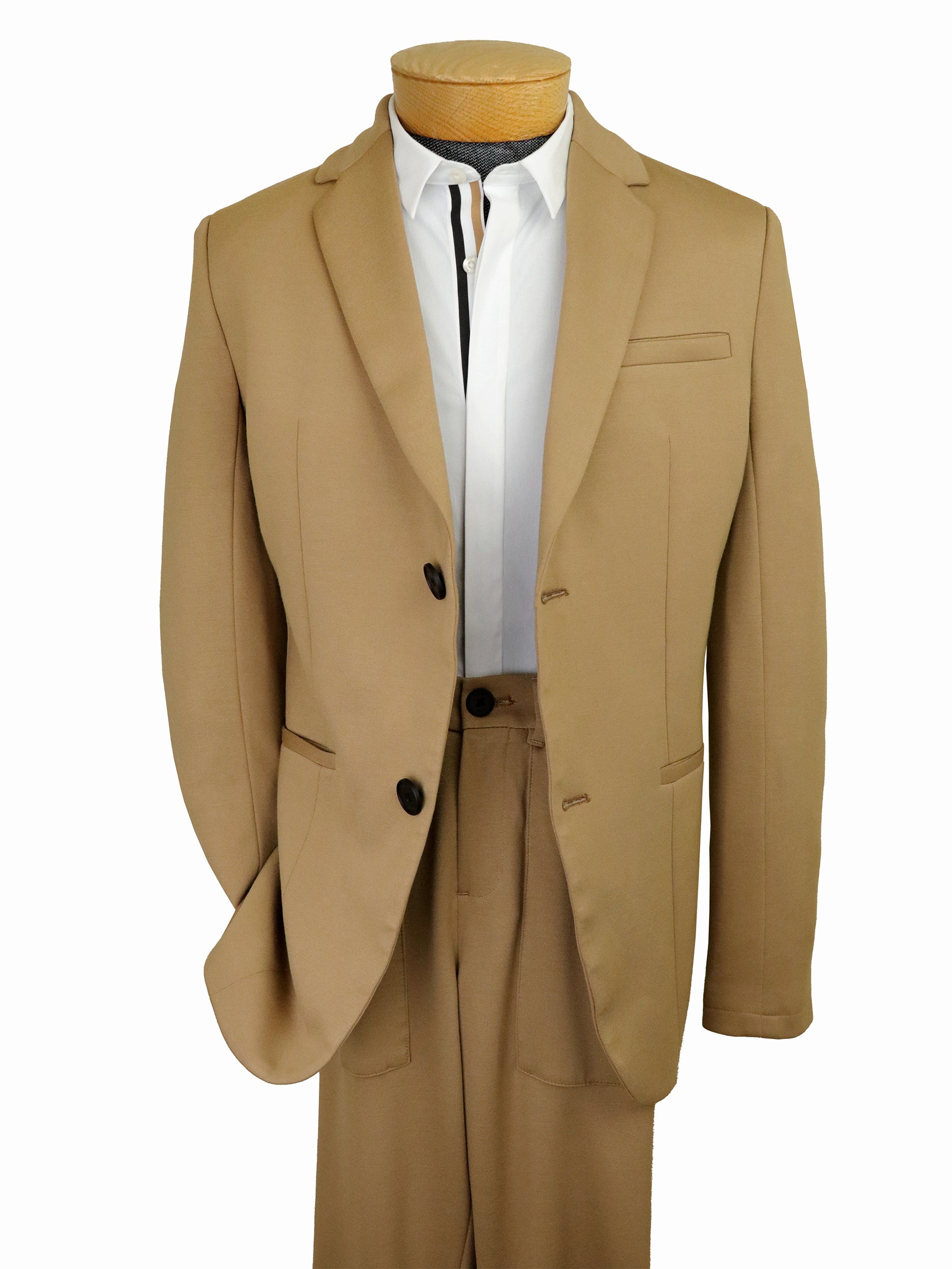 - Jacket: Single breasted, a notched lapel with a single exterior welt breast pocket with two welt hip pockets, a center vent with a single interior welt breast pocket, and stretch fabric.