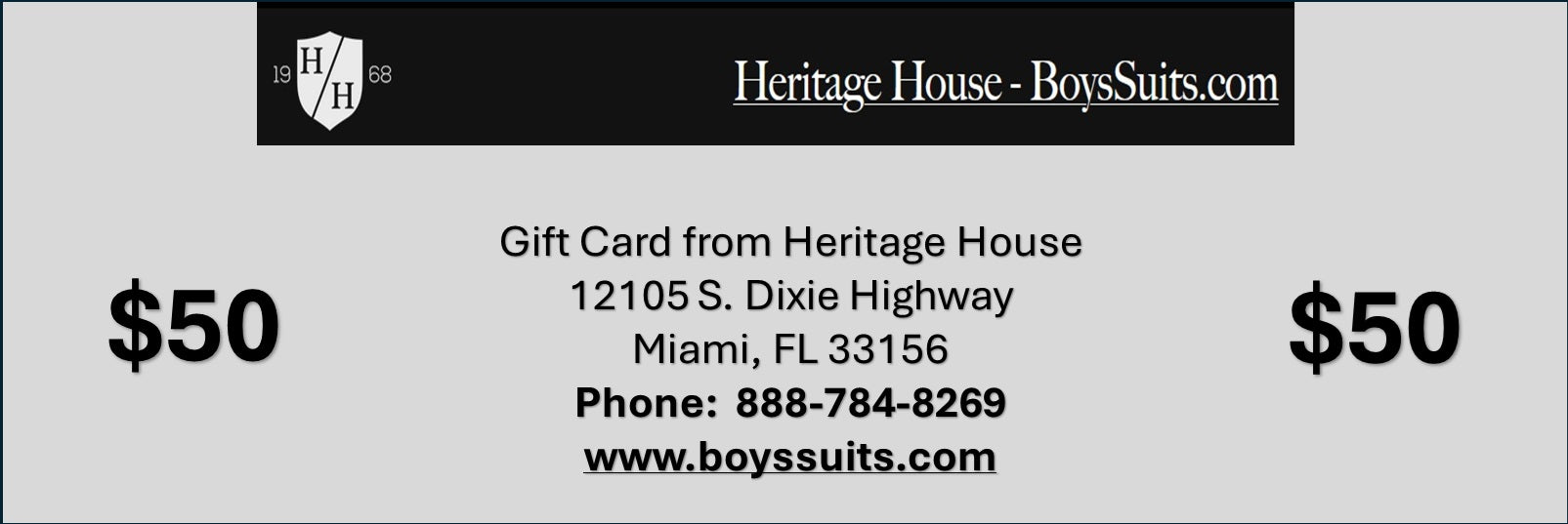 Heritage House gift cards are offered in denominations of $50, $100, $500, and $1,000. Gift card code will be emailed to your recipient. This gift card code can be redeemed on www.boyssuits.com . Alternatively, if your gift card recipient lives in Miami, the recipient can visit us at the store to use the gift card: