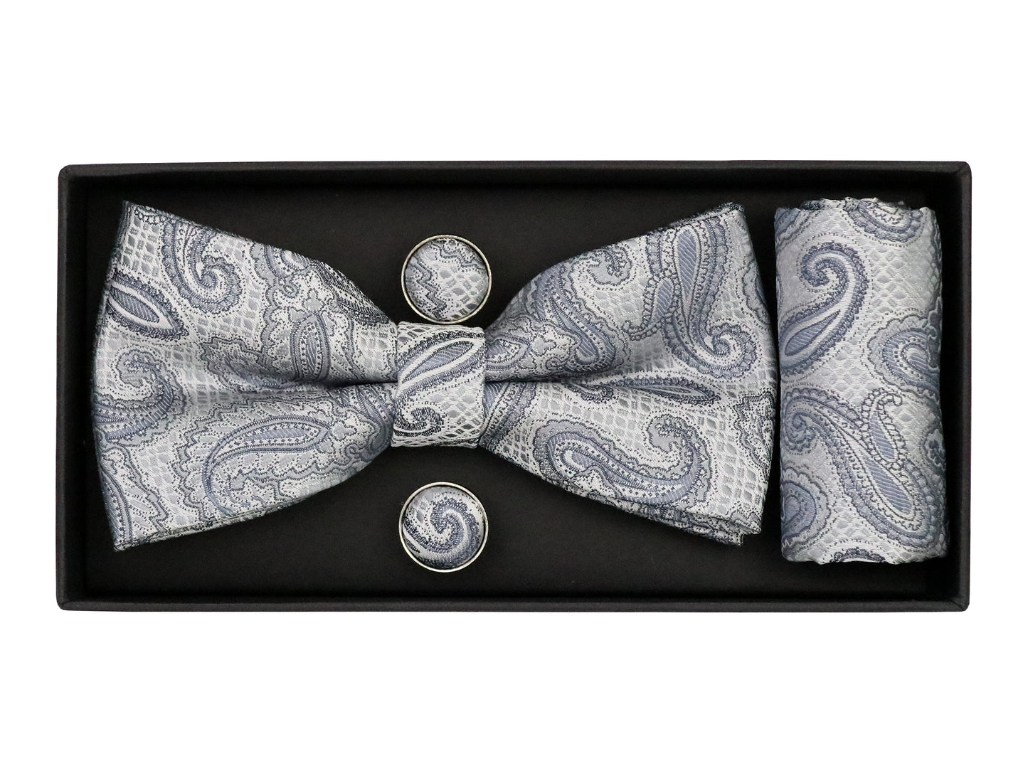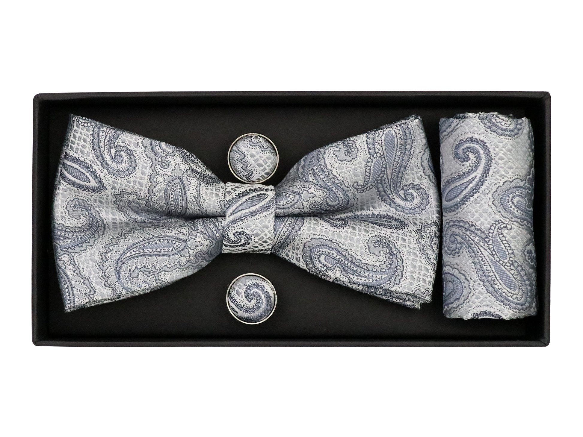 Features of the 38097 Young Men's Bow Tie Set - Paisley - Grey/Blue/White: